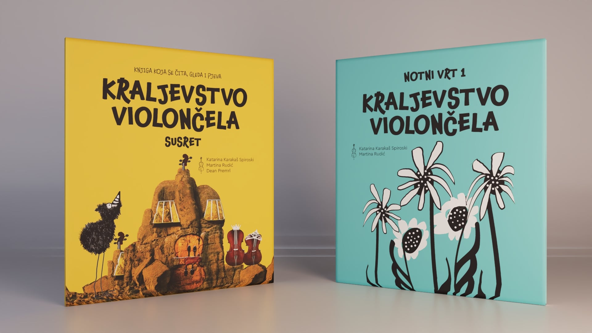 Komplet GLAZBENI DUO spaja dvije knjige – Kraljevstvo violončela i Notni vrt – uz QR kod s 16 originalnih pjesmica, 24 video primjera izvođenja skladbi, društvenu igru i memory karte.